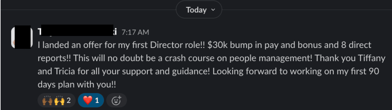 This approach helped my client in making a pivot in her company where she landed her Director promotion and a $30K raise after being stuck at Senior Manager for 8 years. Together, we created contingency plans that opened up new paths for growth that accelerated her promotion track within just 6 weeks of working together.
