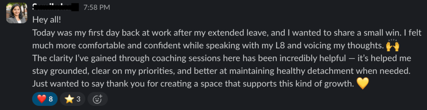 This was a key area I supported my client on recently. She was tired of being talked over and felt her influence was fading, especially amidst an internal reorg. By owning her voice assertively, she stopped asking for permission to lead and secured her Director promotion within a few weeks of working together.