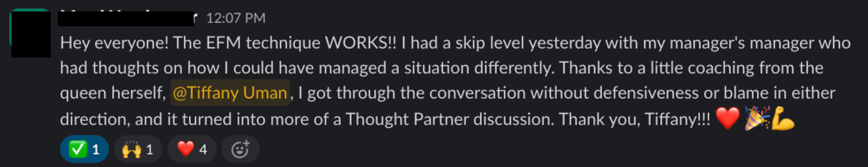 This is the strategy I supported one of my clients on recently who had an important skip level meeting. We leaned into my EFM technique which builds on empathy and shared goals to fuel collaboration, not confrontation. In doing so, she overcame prior pushback from this leader and positioned herself as a thought partner while elevating her credibility.