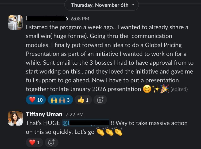​For my client this past week, she finally got out of her own way and put forward an idea for her global team that she'd been putting off for months. Not only did this garner her well-deserved recognition, she's now also reinforced amazing momentum and advocacy from senior leaders influencing her progression.