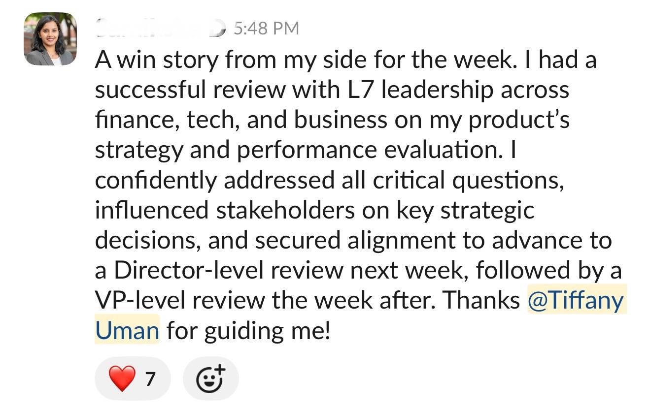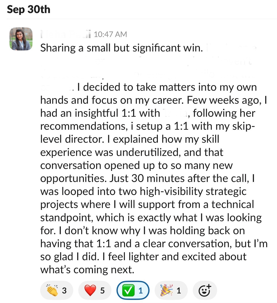 She shared feedback with me that my boss had never shared with me. Actionable feedback that helped me understand my own blind spots like the way I framed my project updates, the level of conviction I showed in my recommendations, and the critical thinking I could better showcase in leadership meetings.
