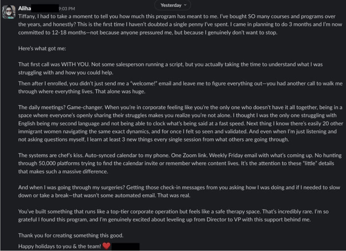As the business grew, I also wanted to deepen our client delivery experience. That's why I intentionally invested in growing a smaller, sharper, more senior core team, one designed to deliver a more thoughtful, daily high-touch experience for every woman we support. More care. More presence. More 1:1 coaching.