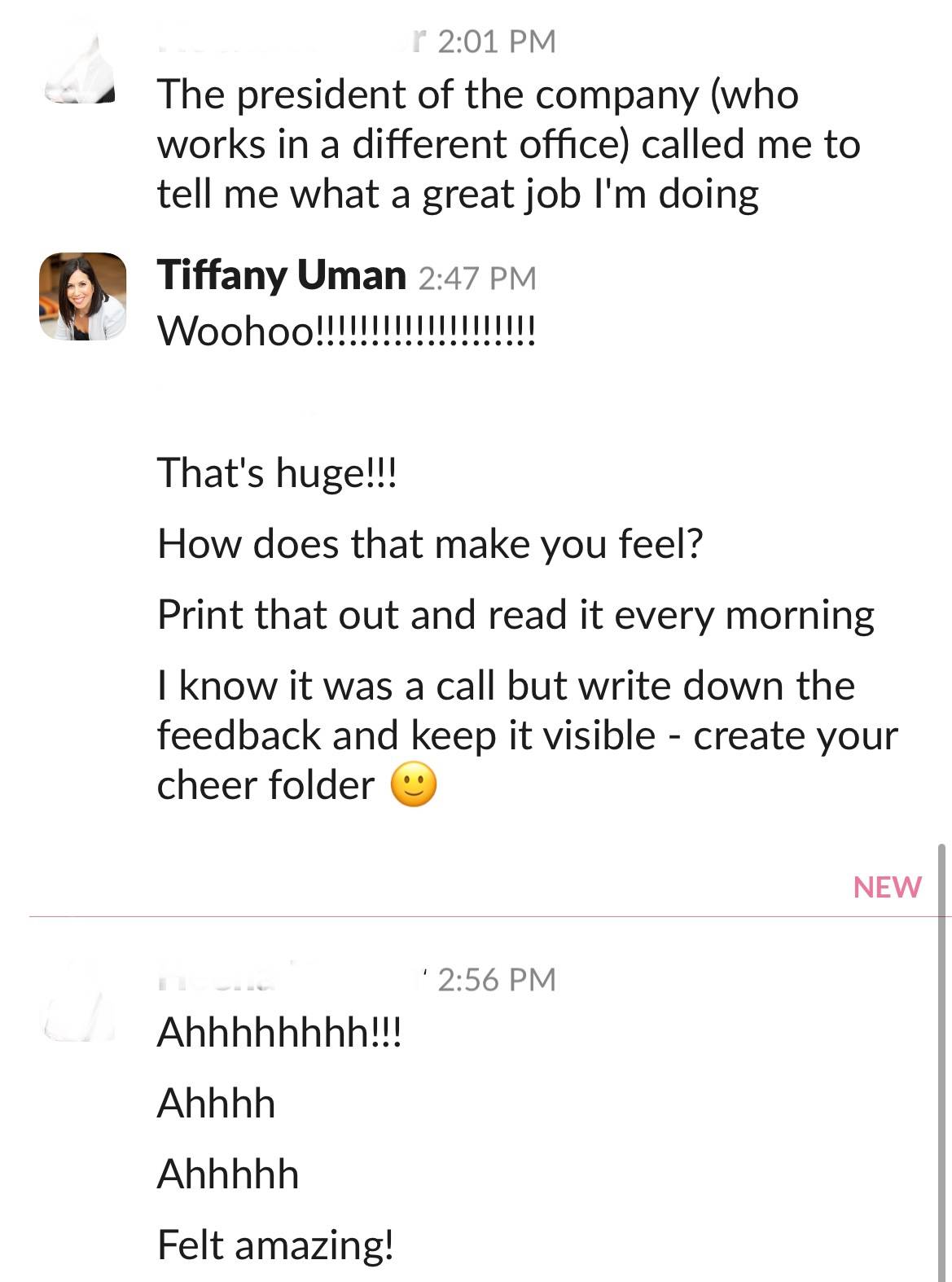 I'm celebrating my client who received a personal phone call from the President of her company to specifically tell her what a great job she's doing in her new role! Having previously dealt with both toxic bosses and toxic workplaces, she had been struggling to get past the PTSD effects of that and rebuild her confidence. So this win is not only huge in terms of her visibility, but also represents a major breakthrough in taking back control of her career success!