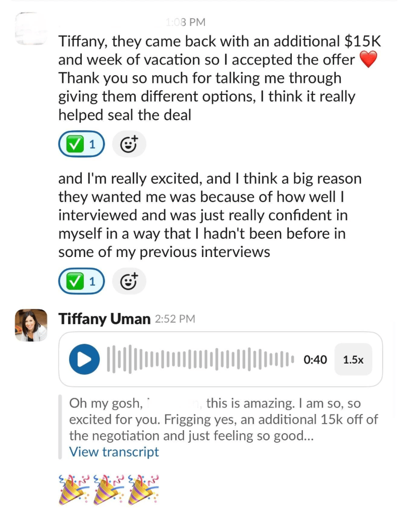This exact shift helped my client secure her new job offer and negotiated for an additional $15K raise on top of an amazing 6-figure comp package that was a major step up from her current position.