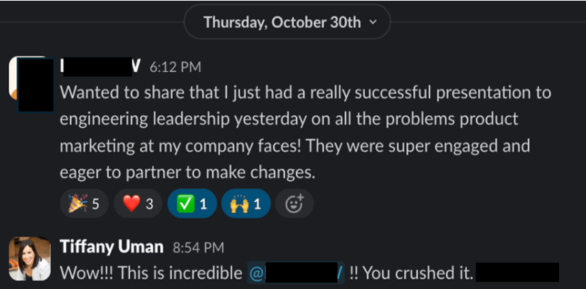 "I applied your recommendation from last quarter’s all-hands meeting and it’s already improved how I run cross-team meetings. I really appreciated you sharing that."