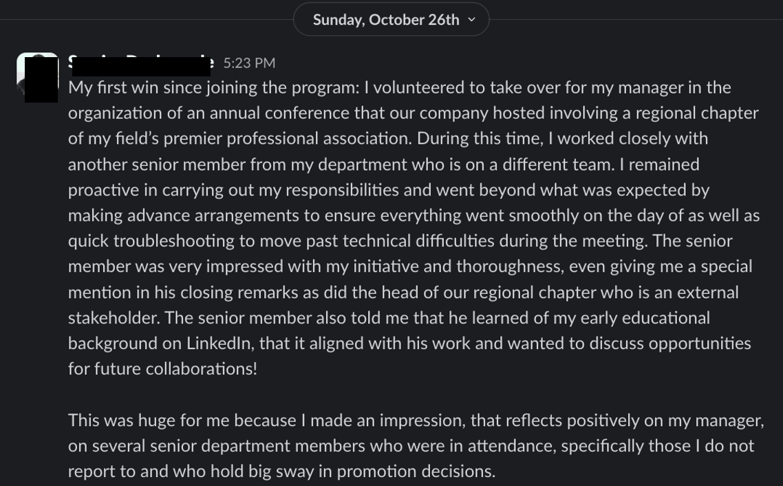 → Join selective projects that expand your reach: Cross-functional visibility is executive visibility. When you contribute beyond your day-to-day work, leaders see you as someone they can trust to take on bigger focuses. Don't just say yes to anything. Choose the projects that compliment your current skillset, expose you to newer areas in the business, and allow for direct visibility and exposure with senior leaders.