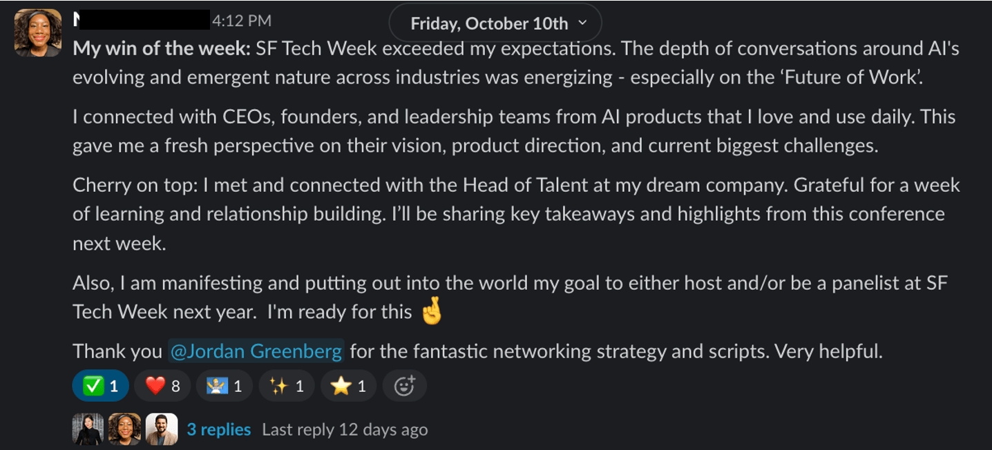 This was the approach I encouraged my client to use to go beyond feeling ready and make bold moves in attending SF Tech Week. She leaned into doing smart experiments and ended up making incredible connections, including one with the Head of Talent at her dream company. Not only this, she's been proactively scheduled for informational interviews at her 2 top companies of choice thanks to these efforts.